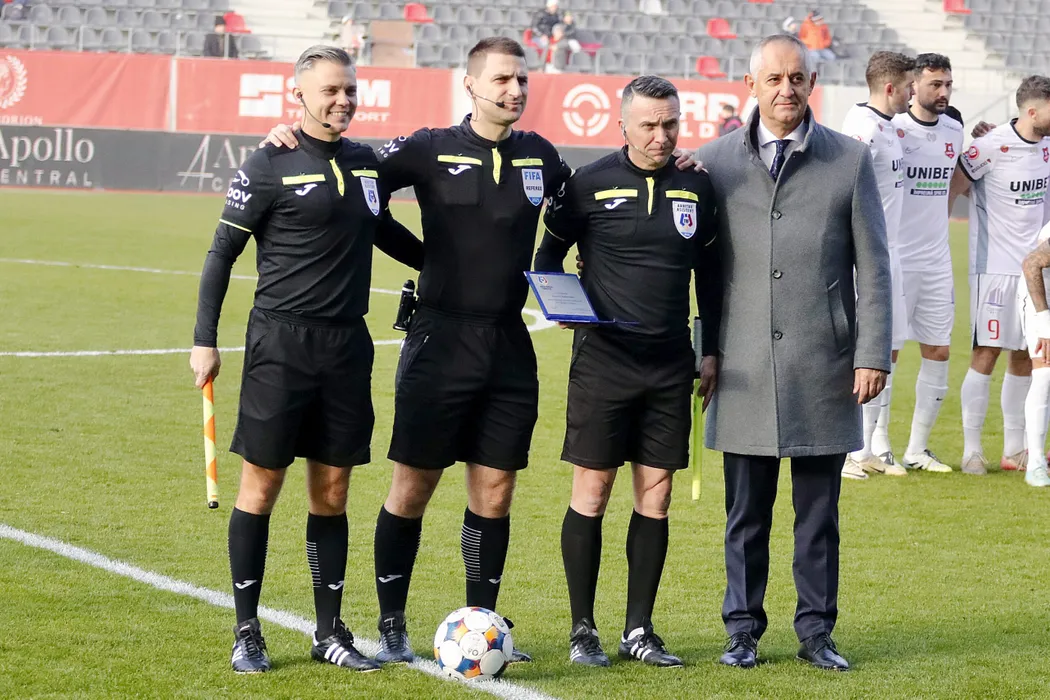 Arbitrul asistent Alexandru Voda, premiat pentru intreaga activitate, alaturi de Arbitrul central Rares George Vidican, Arbitrul asistent Stelian Slabu si Marcel Savaniu inaintea meciului de fotbal dintre AFC Hermannstadt Sibiu si Petrolul Ploiesti, contand pentru Superliga Superbet, desfasurat pe Stadionul Municipal din Sibiu, duminica 21 decembrie 2025. © FOTO:Valentin Macrea/SPORT PICTURES