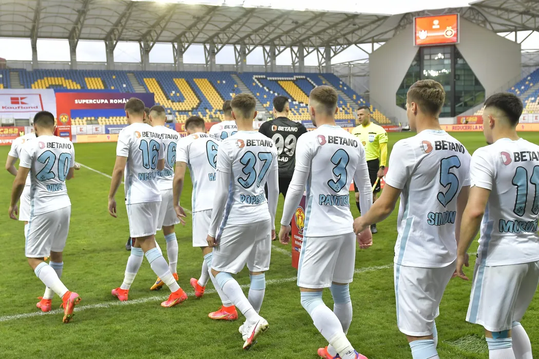 Fotbalistii stelisti la startul meciului de fotbal dintre CFR Cluj si FCSB, Supercupa Romaniei, desfasurat fara spectatori pe Stadionul Ilie Oana din Ploiesti, joi 15 aprilie 2021. © FOTO:Razvan Pasarica/SPORT PICTURES