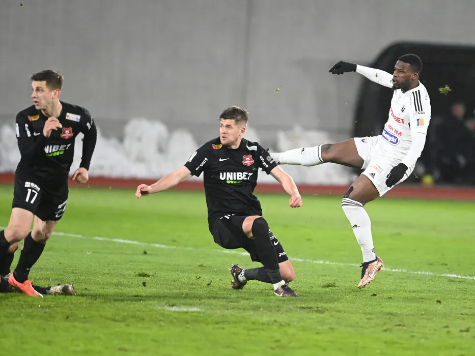Mamadou Thiam marcheaza un gol de langa Mihai Ionut Butean si Cornel Alexandru Ene in meciul de fotbal dintre FC Hermannstadt si Universitatea Cluj, contand pentru Cupa Romaniei, desfasurat pe Stadionul Municipal din Sibiu, miercuri 5 aprilie 2023. © FOTO:Razvan Pasarica/SPORT PICTURES
