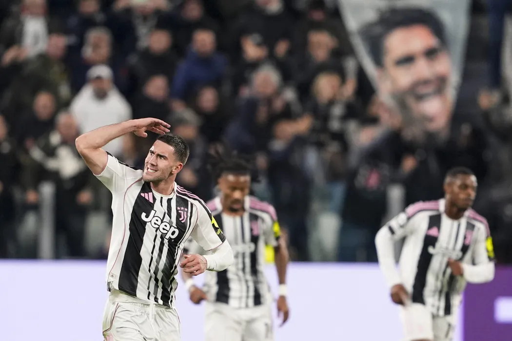04 November 2025, Italy, Turin: Juventus' Dusan Vlahovic celebrates scoring his side's first goal during the UEFA Champions League soccer match between Juventus and Sporting CP at the Allianz Stadium. Photo: Fabio Ferrari/LaPresse via ZUMA Press/dpa