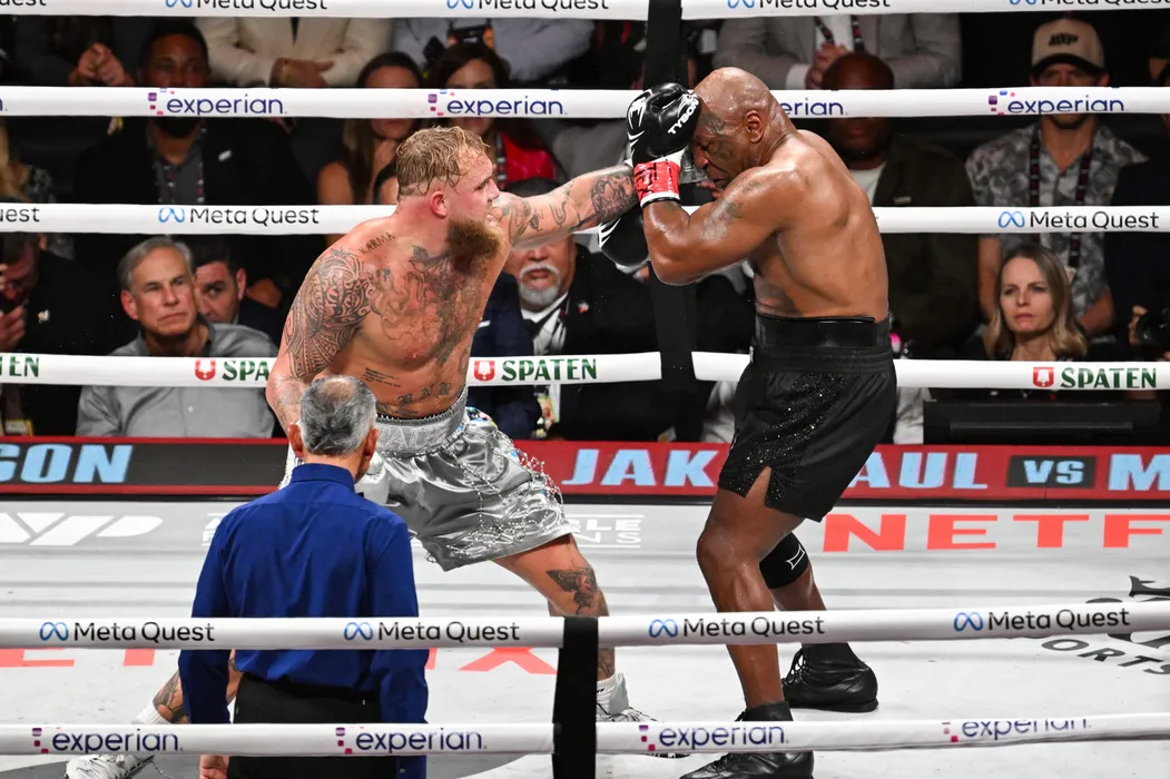 ARLINGTON, TEXAS - NOVEMBER 15: Mike Tyson (in black short) and Jake Paul (in silver short) exchange punches during their heavyweight world titles of the Premiere Boxing Championship on Friday night at AT&T Stadium in Arlington, Texas, United States on November 15, 2024. Tayfun Coskun / Anadolu/ABACAPRESS.COM