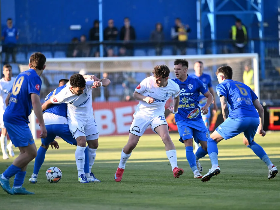 Narek Grigoryan, Eduard Gabriel Radaslavescu si Constantin Dragos Albu in meciul de fotbal dintre Farul Constanta si Gloria Buzau, contand pentru Play out-ului Superligii Superbet, desfasurat pe Stadionul central al Academiei Gheorghe Hagi din Ovidiu, sambata 3 mai 2025. © FOTO:Razvan Pasarica/SPORT PICTURES