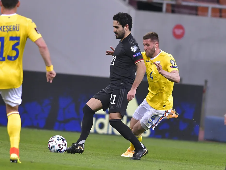 İlkay Gundogan si Ovidiu Popescu in meciul de fotbal dintre Romania si Germania, din cadrul Preliminariilor Campionatului Mondial 2022, desfasurat fara spectatori pe Arena Nationala din Bucuresti, duminica 28 martie 2021. © FOTO:Razvan Pasarica/SPORT PICTURES