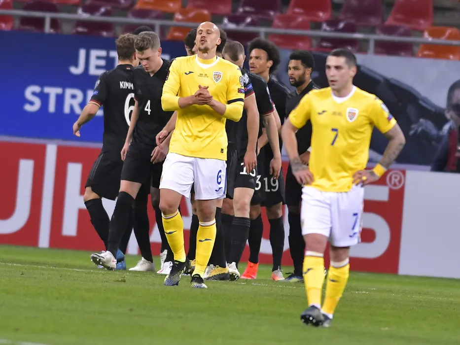 Matthias Ginter si Vlad Chiriches suparat dupa un gol primit in meciul de fotbal dintre Romania si Germania, din cadrul Preliminariilor Campionatului Mondial 2022, desfasurat fara spectatori pe Arena Nationala din Bucuresti, duminica 28 martie 2021. © FOTO:Razvan Pasarica/SPORT PICTURES