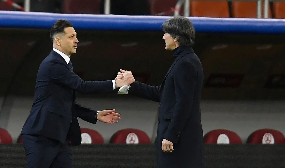 Joachim Low and Mirel Radoi during the game between Romania an Germany, in the World Cup 2022 Qualifiers, at National Arena Bucharest on March 28, 2021 in Bucharest, Romania.
