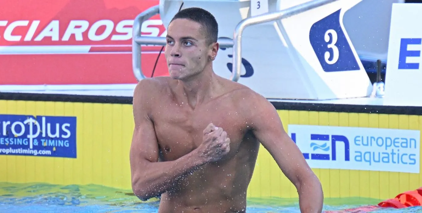 Romania's David Popovici reacts after winning and setting a new world record in the Men's 100m freestyle final event on August 13, 2022 at the LEN European Aquatics Championships in Rome.,Image: 713810697, License: Rights-managed, Restrictions: , Model Release: no
