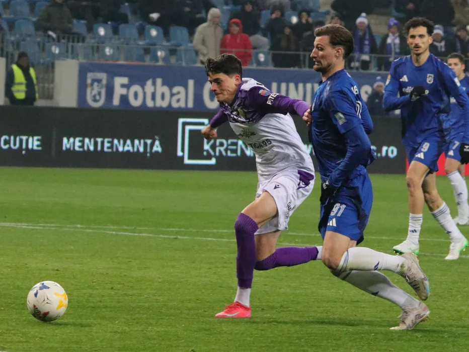 Mario Tudose si Stjn Meijer in meciul de fotbal dintre FCU 1948 Craiova si ACS Campionii FC Arges, contand pentru Liga 2 Casa Pariurilor, desfasurat pe Stadionul Ion Oblemenco din Craiova, marti 25 februarie 2025. © FOTO: Catalin Ciupureanu/SPORT PICTURES