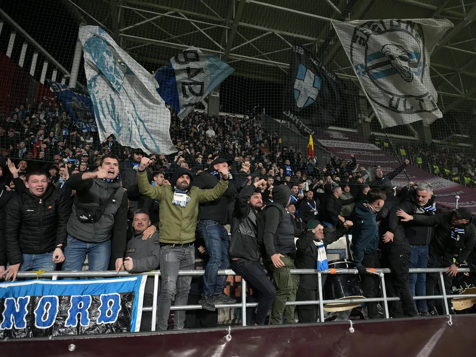 Suporterii craioveni se bucura dupa un gol al favoritilor reusit la meciul de fotbal dintre Rapid Bucuresti si Universitatea Craiova, din cadrul Superligii Superbet, desfasurat pe Superbet Arena-Giulesti din Bucuresti, duminica 8 martie 2026. © FOTO:Razvan Pasarica/SPORT PICTURES