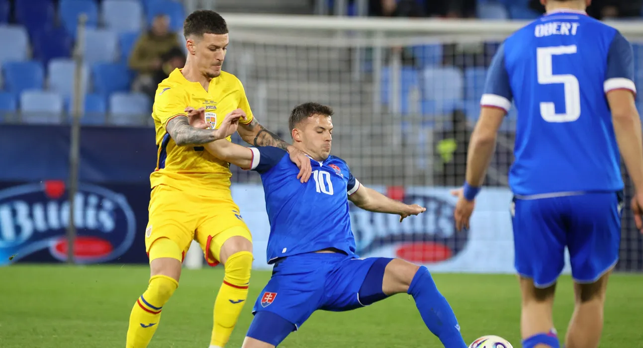 Laszlo Benes si Dennis Man in meciul amical de fotbal dintre Slovacia si Romania, desfasurat pe “Narodny futbalovy stadion” din Bratislava, marti 31 martie 2026. © FOTO:SPORT PICTURES