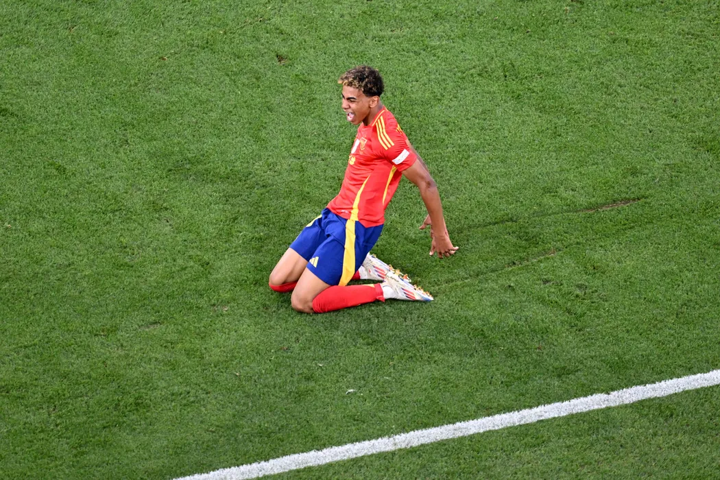 09 July 2024, Bavaria, Munich: Spain's Lamine Yamal celebrates after his side's first goal of the game during the UEFA Euro 2024 Semi-final soccer match between Spain and France at Munich Football Arena. Photo: Sven Hoppe/dpa
