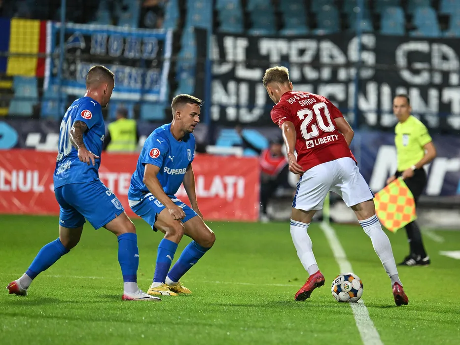Alexandru Cicaldau, Nicusor Silviu Bancu si Daniel Sandu in meciul dintre Otelul Galati si Universitatea Craiova, contand pentru Superliga Superbet, desfasurat pe Stadionul Otelul din Galati, sambata 20 septembrie 2025. © FOTO:Razvan Pasarica/SPORT PICTURES