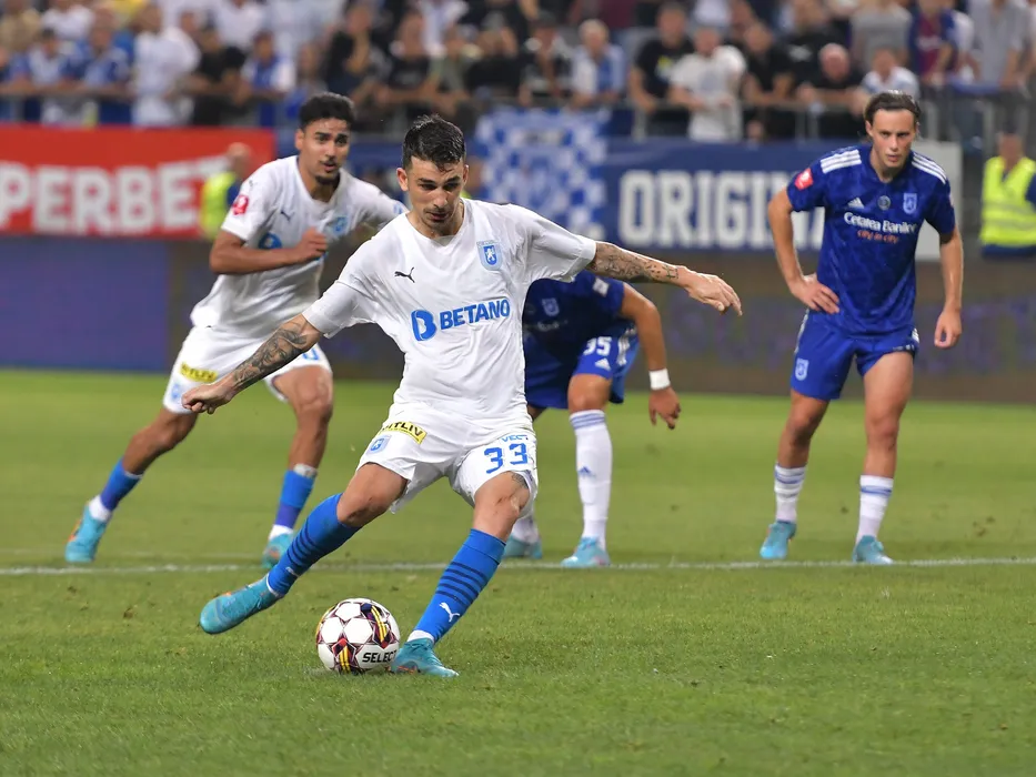 Sergiu Catalin Hanca marcheaza un gol din penalty in meciul de fotbal dintre FC U Craiova si Universitatea Craiova, contand pentru Superliga Superbet, desfasurat pe Stadionul Ion Oblemenco din Craiova, duminica 7 august 2022. © FOTO:Razvan Pasarica/SPORT PICTURES