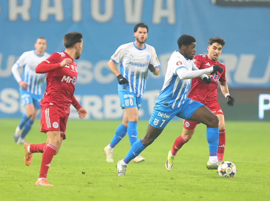 Aimé Steven Nsasa Nsimba, Tudor Cristian Baluta si Pedro Nuno Fernandes Ferreira, Andre Miguel Pinto Lopes in meciul de fotbal dintre Universitatea Craiova si SC Otelul Galati, contand pentru Superliga Superbet, desfasurat pe Stadionul Ion Oblemenco din Craiova, joi 5 februarie 2026. © FOTO:Sorin Pana/SPORT PICTURES