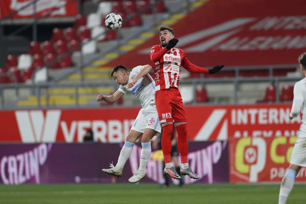 Olimpiu Morutan (S), de la FCSB si Cristian Albu (D)< de la UTA Arad, lupta pentru posesia balonului in meciul de fotbal din etapa a XXVII-a a Ligii I dintre UTA Arad si FCSB, disputat pe stadionul Francisc Neuman din Arad, sambata, 13 martie 2021. SEBASTIAN TATARU / MEDIAFAXFOTO