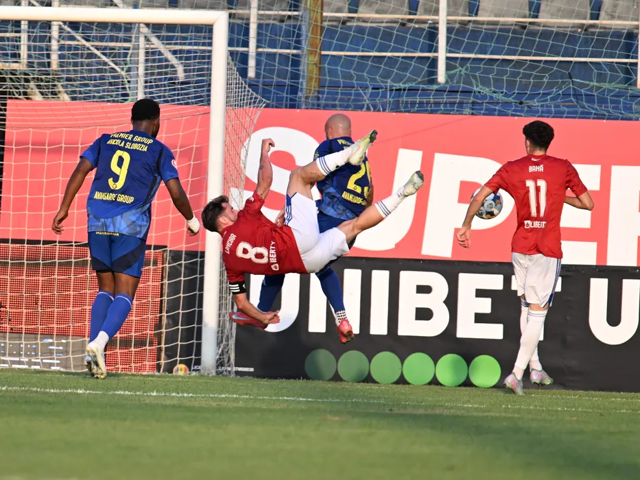 Joao Pedro Santos Lameira si Stefan Daniel Bana in meciul dintre Unirea Slobozia si Otelul Galati, contand pentru Superliga Superbet, desfasurat pe Clinceni Arena din Clinceni, luni 4 august 2025. © FOTO:Razvan Pasarica/SPORT PICTURES