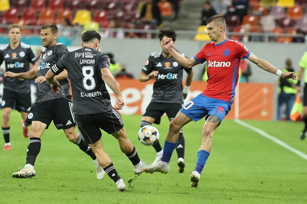 Florin Lucian Tănase si Milen Zhelev, Joao Pedro Santos Lameira in meciul dintre FCSB si Otelul Galati, contand pentru Superliga Superbet, desfasurat pe Arena Nationala din Bucuresti, duminica 28 septembrie 2025. © FOTO:Gheorghe Fluster/SPORT PICTURES