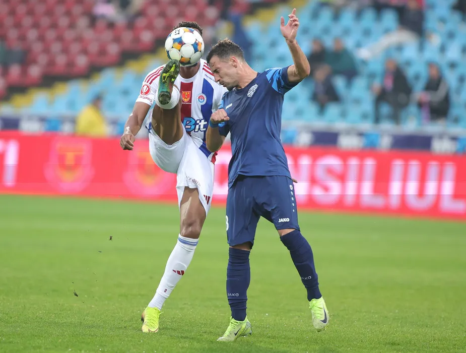 Fernandes Fabio Patrick Dos Reis Dos Santos si Razvan Cristian Milea in meciul de fotbal dintre SC Otelul Galati si FC Metaloglobus Bucuresti, contand pentru Superliga Superbet, desfasurat pe Stadionul Otelul din Galati, luni 6 octombrie 2025. © FOTO:Sorin Pana/SPORT PICTURES