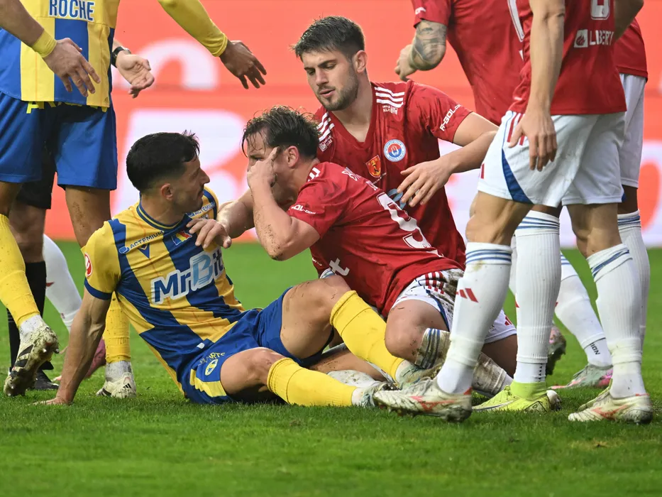Miranda Ricardo Jose Veiga Varzim discută cu Holz Conrado Buchanelli la pamant sub privirile lui Paul Alexandru Iacob in meciul dintre Petrolul Ploiesti si Otelul Galati, contand pentru Superliga Superbet, desfasurat pe Stadionul Ilie Oana din Ploiesti, sambata 8 noiembrie 2025. © FOTO:Razvan Pasarica/SPORT PICTURES