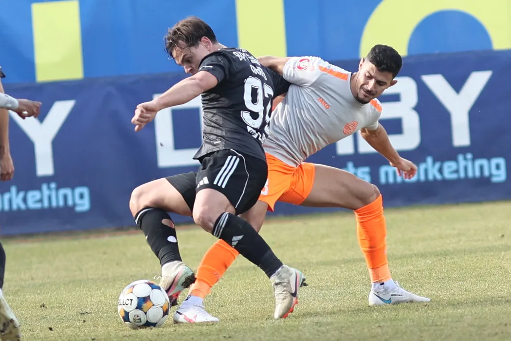 Holz Conrado Buchanelli si Mircea Alexandru Tirlea in meciul de fotbal dintre Metaloglobus Bucuresti si SC Otelul Galati, contand pentru Superliga Superbet, desfasurat pe Clinceni Arena din Clinceni, sambata 14 februarie 2026. © FOTO:Gheorghe Fluster/SPORT PICTURES