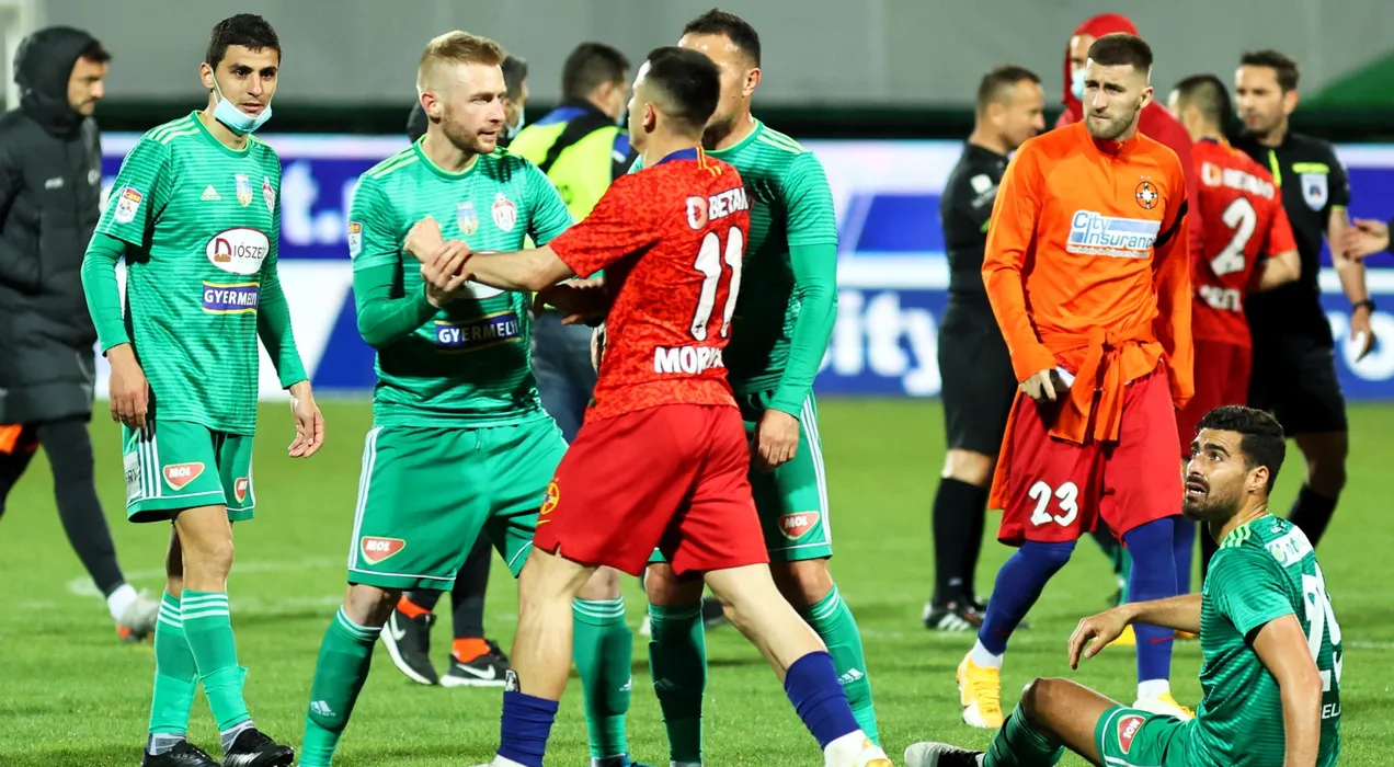Altercatie intre Olimpiu Morutan(C), de la FCSB, si jucatorii Sepsi OSK in timpul meciului de fotbal din etapa 3 a play-off-ului Ligii 1, disputat pe stadionul Marin Anastasovici din Giurgiu, duminica, 25 aprilie 2021. GEORGE FILIP / MEDIAFAX FOTO