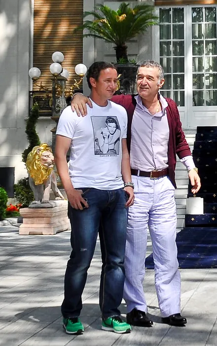 Tehnicianul Laurentiu Reghecampf (S) este primit, luni, 21 mai 2012, de finantatorul FC Steaua, George Becali (D), la resedinta acestuia din Bucuresti, pentru a discuta preluarea functiei de antrenor principal al echipei Steaua Bucuresti. CATALIN ABAGIU / MEDIAFAX FOTO