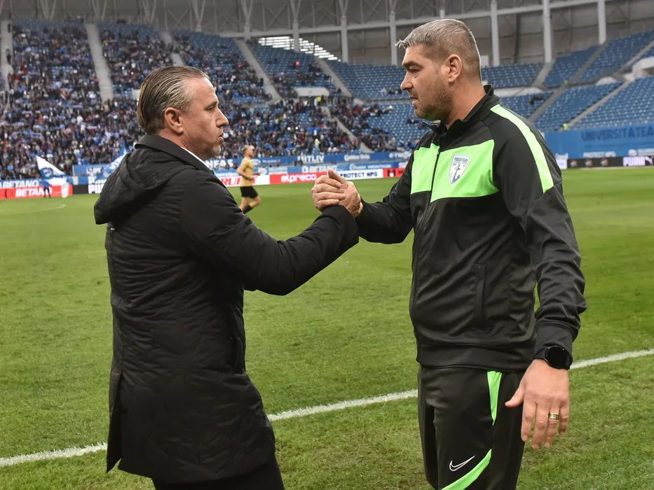 Cei doi antrenori Laurentiu Aurelian Reghecampf si Liviu Ciobotariu se saluta inaintea meciului de fotbal dintre Universitatea Craiova si FC Voluntari, contand pentru Play-off-ul Ligii 1 Casa Pariurilor, desfasurat pe Stadionul Ion Oblemenco din Craiova, sambata 30 aprilie 2022. © FOTO:Razvan Pasarica/SPORT PICTURES