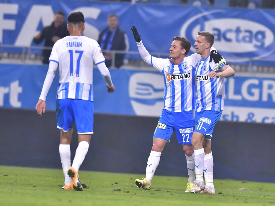 Bucurie a fotbalistilor craioveni dupa un gol marcat cu Gustavo Vagenin si Nicusor Silviu Bancu in meciul de fotbal dintre Universitatea Craiova si Chindia Targoviste, contand pentru Liga 1 Casa Pariurilor, desfasurat pe Stadionul Ion Oblemenco din Craiova, vineri 25 februarie 2022. © FOTO:Razvan Pasarica/SPORT PICTURES