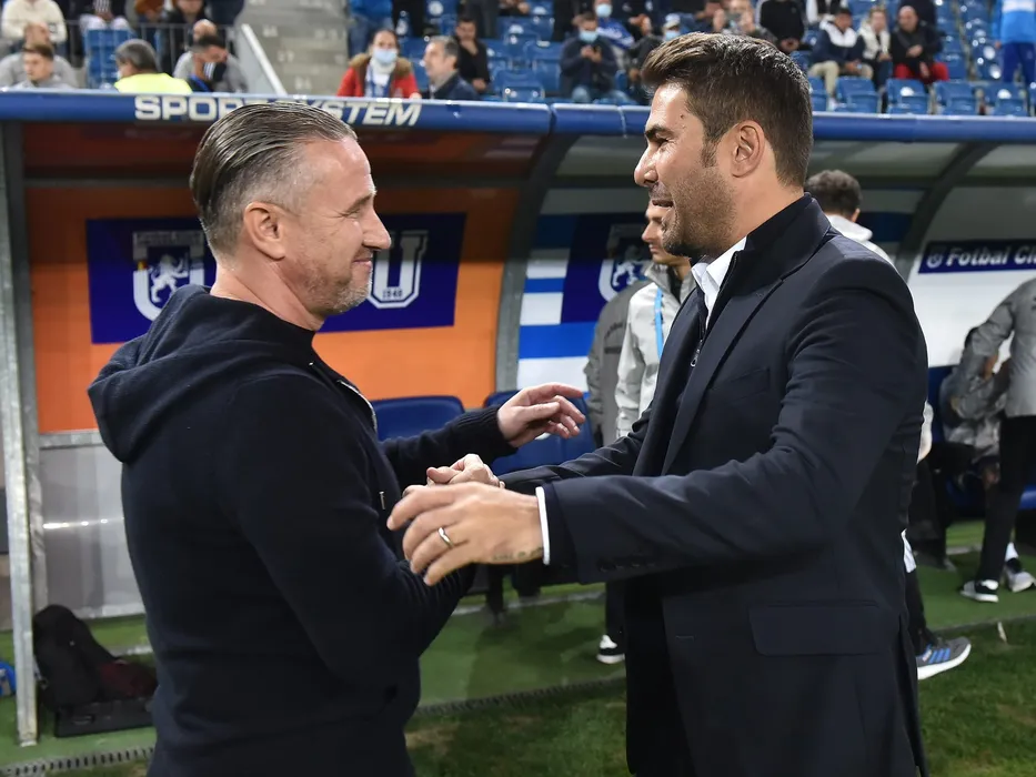 Cei doi antrenori Laurentiu Aurelian Reghecampf si Adrian Mutu se saluta inaintea meciului de fotbal dintre FC U Craiova si Universitatea Craiova, contand pentru Liga 1 Casa Pariurilor, desfasurat pe Stadionul Ion Oblemenco din Craiova, duminica 3 octombrie 2021. © FOTO:Razvan Pasarica/SPORT PICTURES
