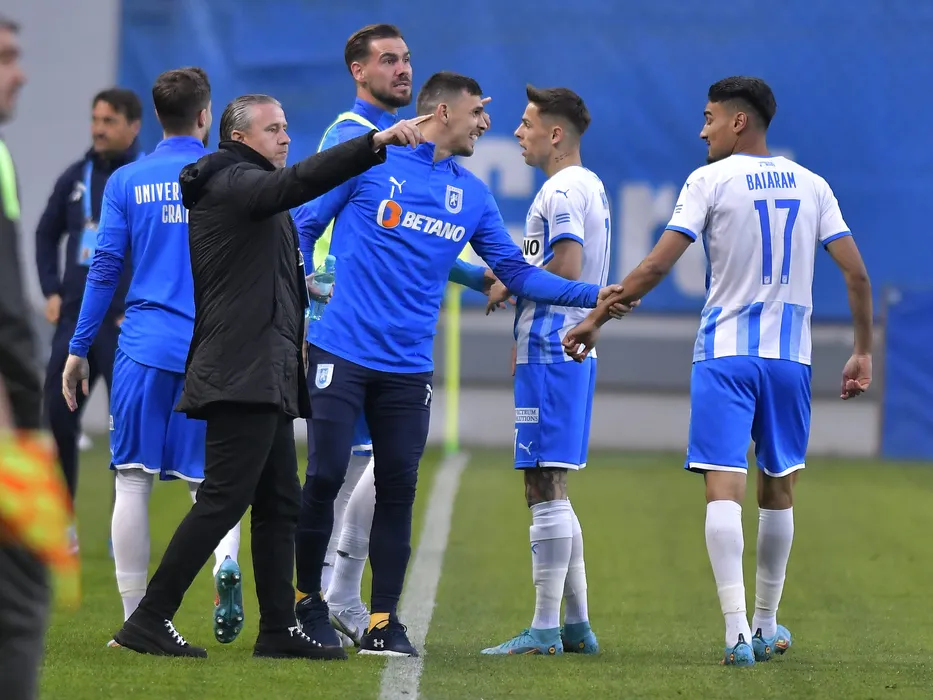 Laurentiu Aurelian Reghecampf alaturi de fotbalistii craioveni Elvir Koljic, Alexandru George Cimpanu si Stefan Baiaram in meciul de fotbal dintre Universitatea Craiova si FC Voluntari, contand pentru Play-off-ul Ligii 1 Casa Pariurilor, desfasurat pe Stadionul Ion Oblemenco din Craiova, sambata 30 aprilie 2022. © FOTO:Razvan Pasarica/SPORT PICTURES