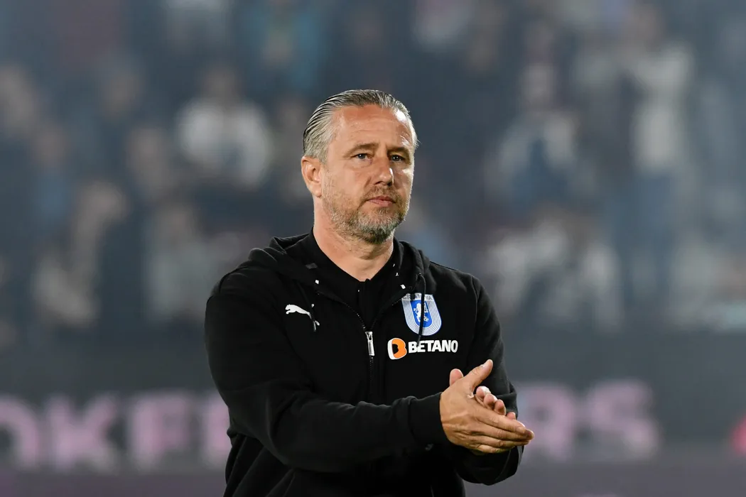 Laurentiu Reghecampf, antrenorul echipei CS Universitatea Craiova, urmareste meciul de fotbal contra formatiei CFR Cluj din etapa a 9- a a play-off-ului Ligii 1, disputat pe stadionul Dr. Constantin Radulescu, duminica, 15 mai 2022. FLAVIU BUBOI / MEDIAFAX FOTO