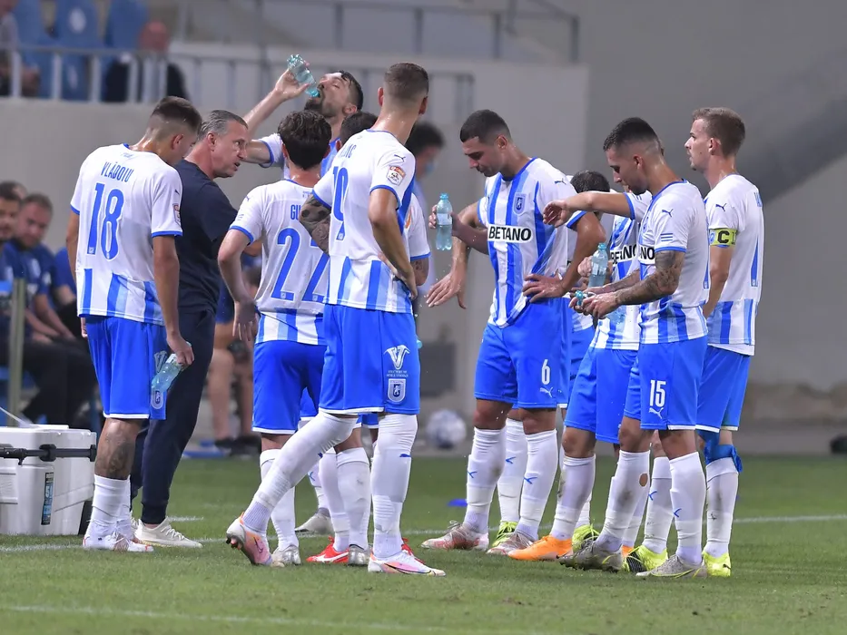 Laurentiu Aurelian Reghecampf alaturi de fotbalistii craioveni printre care Screciu Vladimir Ionut, Nicusor Silviu Bancu si Ovidiu Bic la o pauza de hidratare in meciul de fotbal dintre Universitatea Craiova si KF Laci, contand pentru Turul 2 preliminar, mansa secunda a Conference League, desfasurat pe Stadionul Ion Oblemenco din Craiova, joi 29 iulie 2021. © FOTO:Razvan Pasarica/SPORT PICTURES
