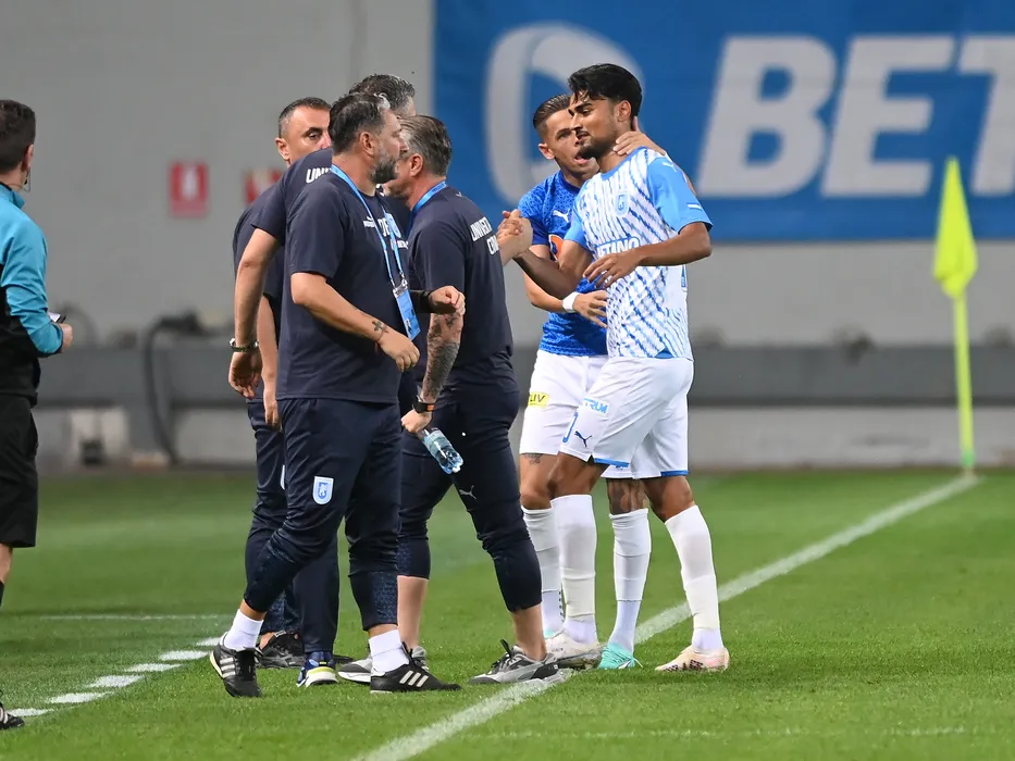 Stefan Baiaram este felicitat de catre Alexandru George Cimpanu dupa un gol marcat in meciul de fotbal dintre Universitatea Craiova si UTA Arad, contand pentru Superliga Superbet, desfasurat pe Stadionul Ion Oblemenco din Craiova, vineri 18 august 2023. © FOTO:Razvan Pasarica/SPORT PICTURES