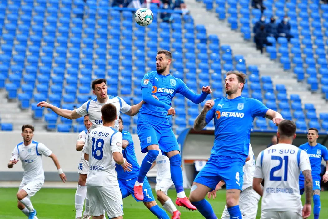 Elvir Kolic (C) de la Universitatea Craiova, sare la balon in timpul meciului de fotbal contra echipei ACS Viitorul Pandurii Targu Jiu din semifinalele Cupei Romaniei, disputat pe stadionul Ion Oblemenco din Craiova, miercuri, 14 aprilie 2021. REMUS BADEA / MEDIAFAX FOTO