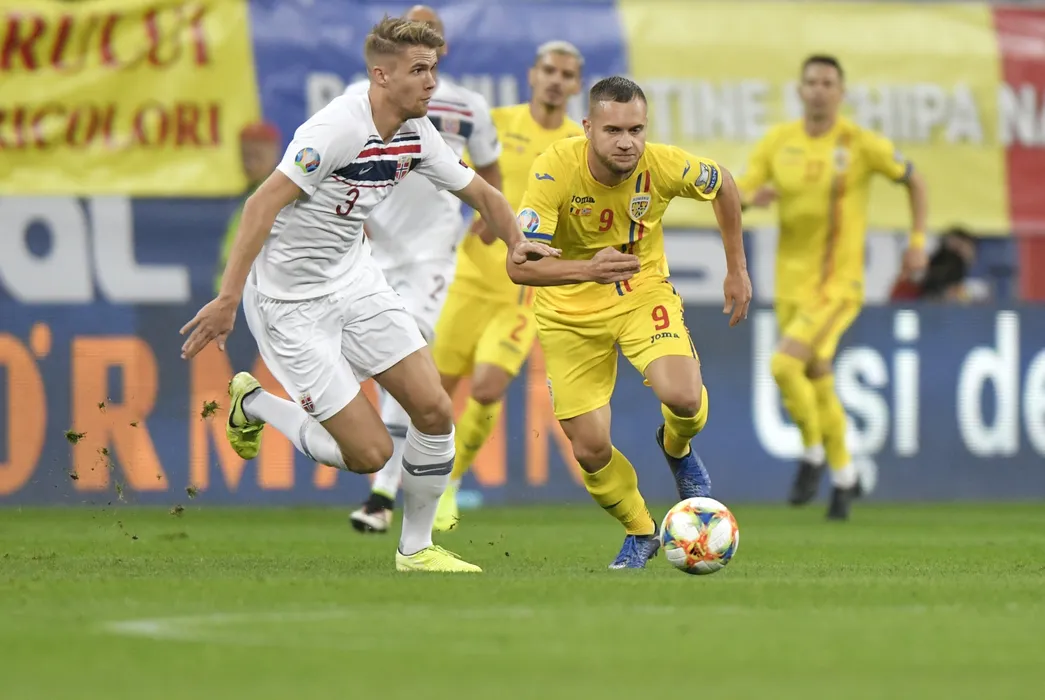 George Puscas (D), de la nationala Romaniei, suteaza in timpul meciului de fotbal contra selectionatei Norvegiei, din Grupa F a preliminariilor Euro 2020, disputat pe Arena Nationala din Bucuresti, marti, 15 octombrie 2019. ANDREEA ALEXANDRU / MEDIAFAX FOTO
