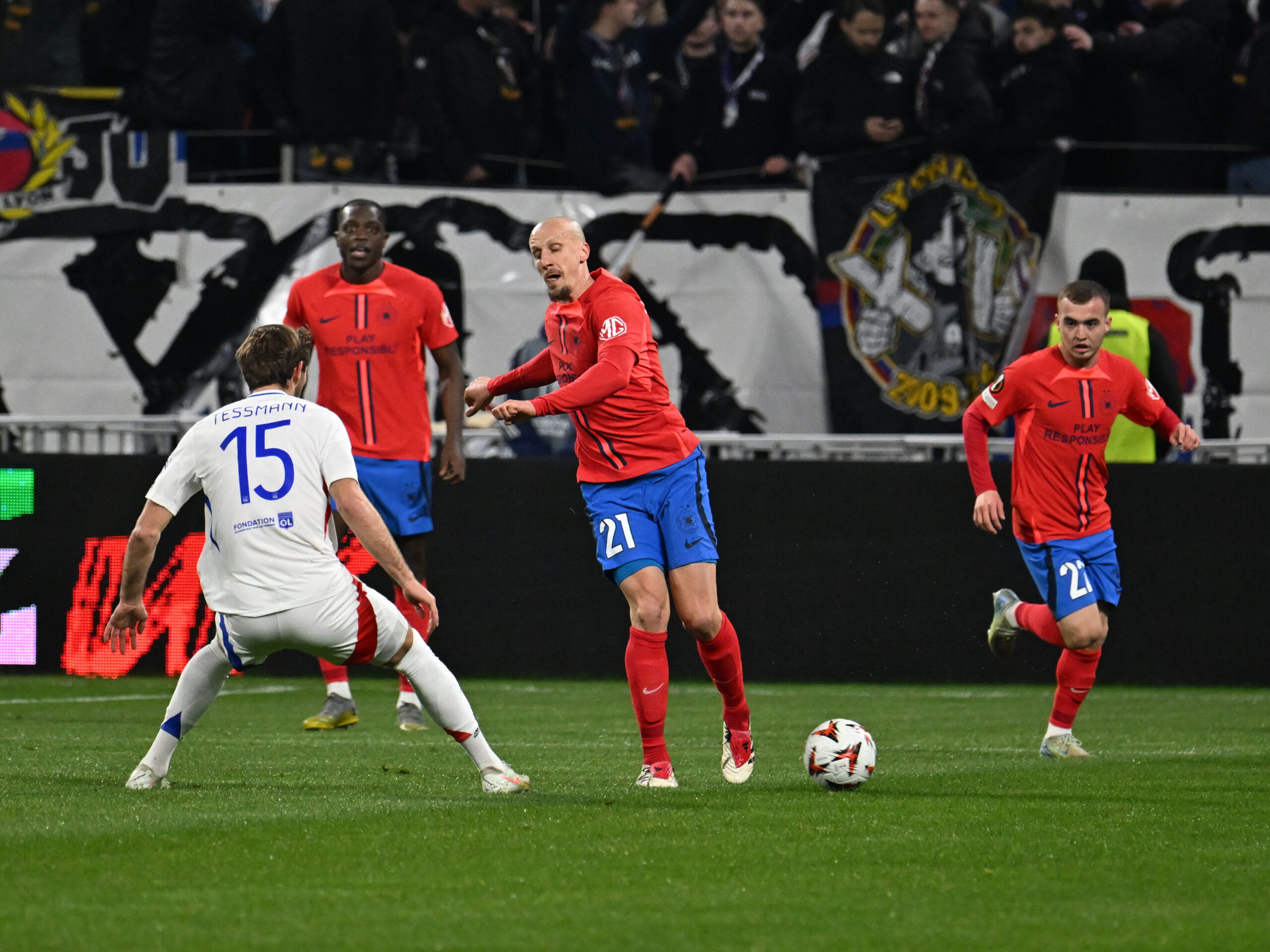 Vlad Iulian Chiricheș si Mihai Vlăduț Toma in meciul de fotbal dintre Olympique Lyon si FCSB din cadrul UEFA Europa League, desfasurat pe Groupama Arena din Lyon, joi 13 martie 2025. © FOTO:Razvan Pasarica/SPORT PICTURES