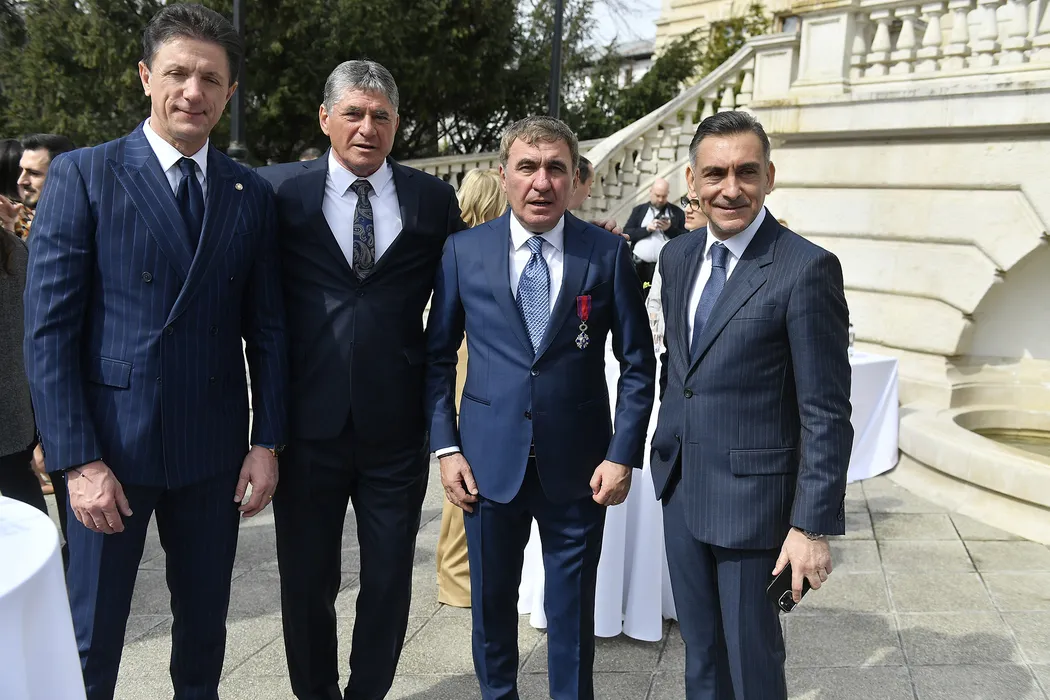 Gheorghe Popescu, Stefan Iovan, Gheorghe Hagi si Ilie Dumitrescu la ceremonia de decorare a lui Gheorghe Hagi de catre presedintele interimar Ilie Bolojan cu cea mai inalta distinctie a statului roman Ordinul National "Steaua Romaniei" in grad de Cavaler, eveniment organizat la Palatul Cotroceni, miercuri 12 martie 2025. © FOTO: Simion Mechno/SPORT PICTURES