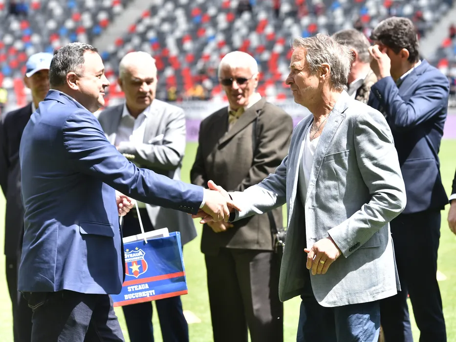 Tudorel Stoica premiat de catre Razvan Bichir in pauza meciului de fotbal dintre Steaua Bucuresti si Unirea Slobozia, contand pentru Play-off-ul Ligii a-2-a Casa Pariurilor, desfasurat pe Stadionul Steaua-Ghencea din Bucuresti, duminica 8 mai 2022. © FOTO:Razvan Pasarica/SPORT PICTURES