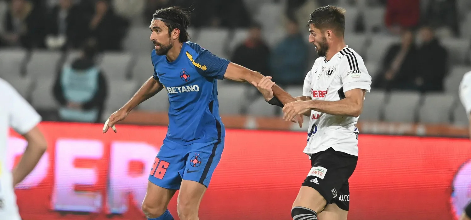 Andrea Compagno si Ovidiu Andrei Pitian in meciul de fotbal dintre Universitatea Cluj si FCSB, contand pentru Superliga Superbet, desfasurat pe Cluj Arena din Cluj Napoca, duminica 31 octombrie 2022. © FOTO:Razvan Pasarica/SPORT PICTURES