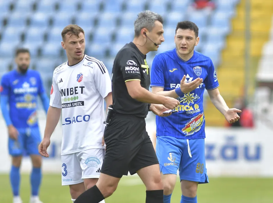Arbitrul central Horatiu Mircea Fesnic si Denis Constantin Dumitrascu, Eugen Gabriel David in meciul de fotbal dintre Gloria Buzau si FC Botosani, contand pentru SuperLiga Superbet - Play-Out, desfasurat pe Stadionul Gloria din Buzau, duminica 27 aprilie 2025. © FOTO: Cristi Stavri/SPORT PICTURES