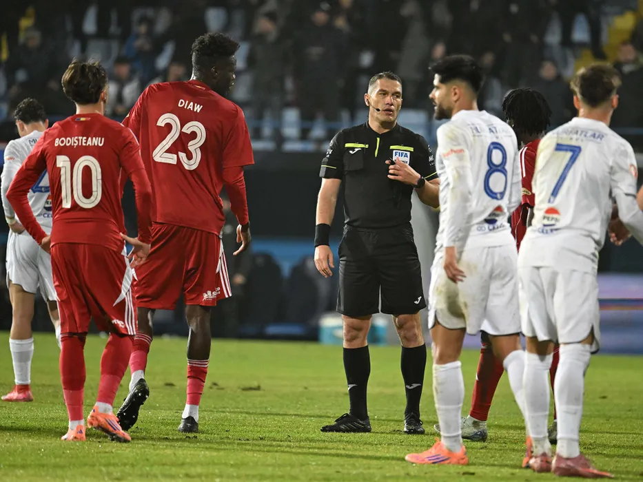 Arbitrul central Istvan Kovacs reacționează alături de Stefan Bodisteanu si Elhadji Pape Djibril Diaw in meciul de fotbal dintre Farul Constanta si FC Botosani, contand pentru Superliga Superbet, desfasurat pe Stadionul central al Academiei Gheorghe Hagi din Ovidiu, vineri 7 noiembrie 2025. © FOTO:Razvan Pasarica/SPORT PICTURES