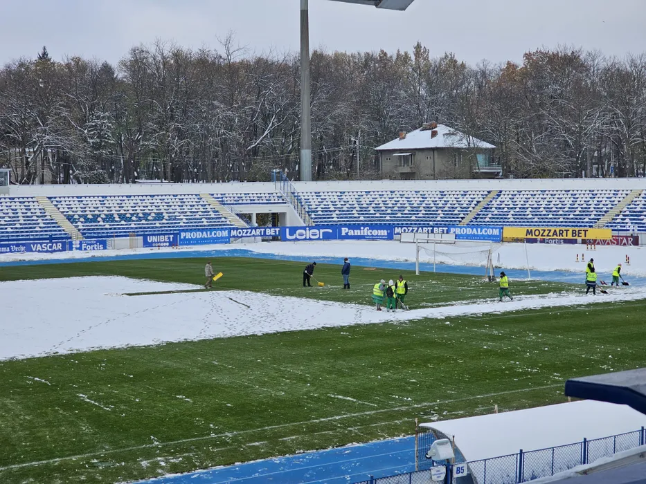 Leo Grozavu a pus mâna pe lopată și a ajutat la deszăpezirea terenului din Copou. La Iași a nins aproape toată noaptea, dar suprafața de joc se prezintă în condiții foarte bune. FOTO