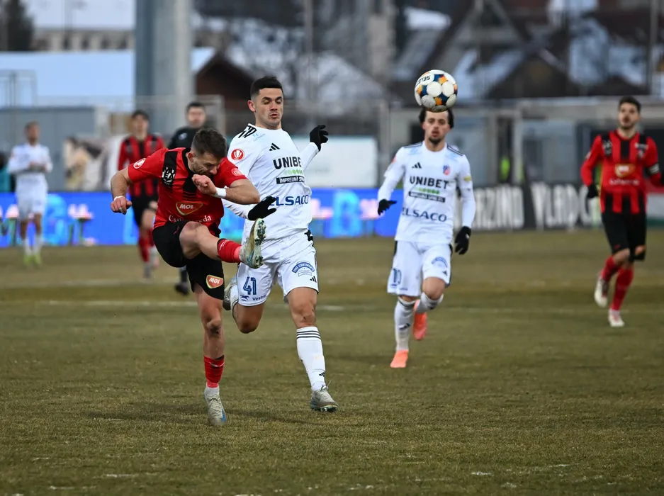Erwin Szilárd Bloj si Ioan Andrei Vasile Dumiter in meciul de fotbal dintre FK Csikszereda Miercurea Ciuc si FC Botosani, contand pentru Superliga Superbet, desfasurat pe Stadionul Municipal din Miercurea Ciuc, duminica 18 ianuarie 2026. © FOTO:Tudy/SPORT PICTURES
