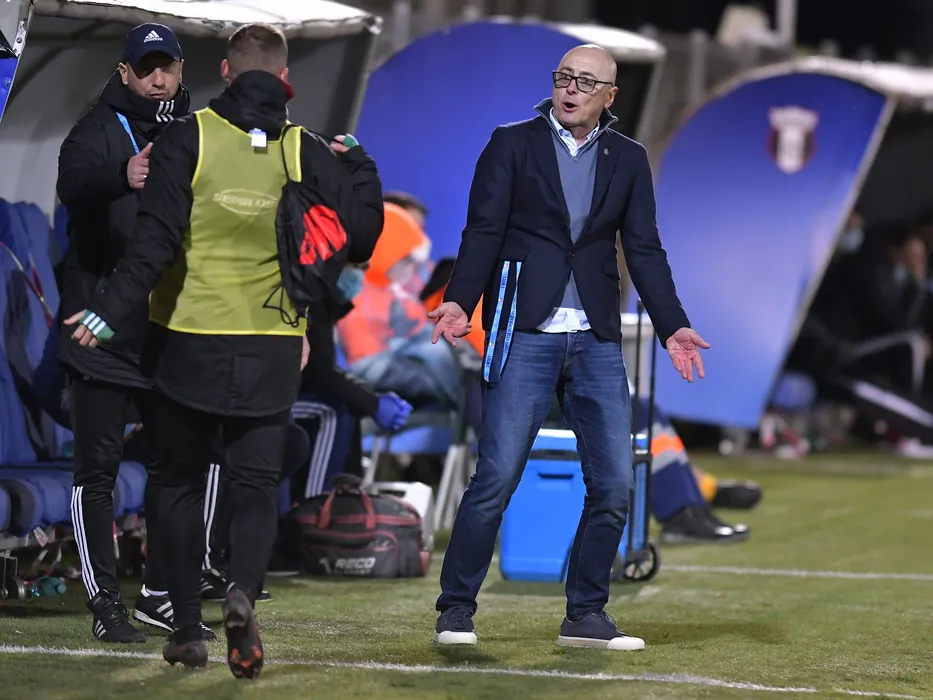 Leo Grozavu si Robert Ilyes discuta cu Bryan Jerome Gilbert Nouvier in meciul de fotbal dintre FCSB si Sepsi OSK Sfantu Gheorghe, contand pentru Play-off-ul Ligii 1 Casa Pariurilor, desfasurat fara spectatori pe Stadionul Marin Anastasovici din Giurgiu, duminica 25 aprilie 2021. © FOTO:Razvan Pasarica/SPORT PICTURES