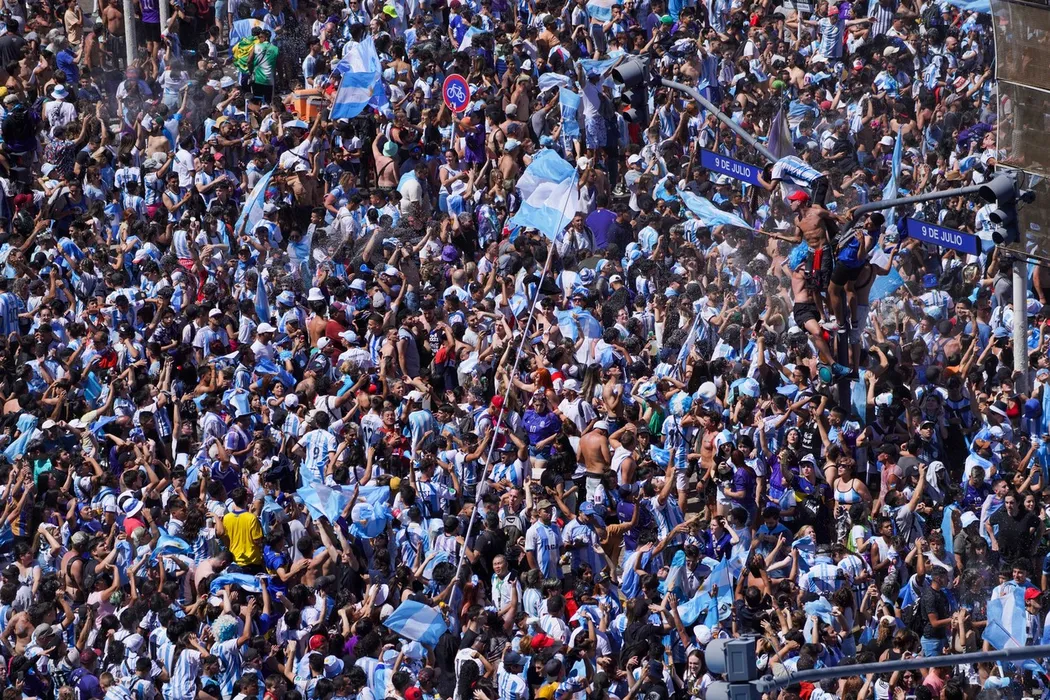Argentine soccer fans celebrate their team's World Cup victory over France, in Buenos Aires, Argentina, Sunday, Dec. 18, 2022.,Image: 745402714, License: Rights-managed, Restrictions: This content is intended for editorial use only. For other uses, additional clearances may be required., Model Release: no