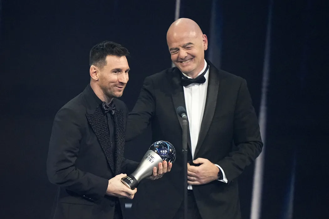 Argentina's Lionel Messi, left, receives the Best FIFA Men's player award from FIFA president Gianni Infantino during the ceremony of the Best FIFA Football Awards in Paris, France, Monday, Feb. 27, 2023. (AP Photo/Michel Euler)