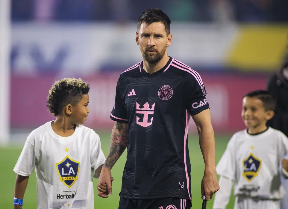 February 26, 2024, Carson, California, USA: Lionel Messi #10 of the Inter Miami enters the field with Saint West, son of Kim Kardashian prior to their regular season game against the LA Galaxy on Sunday February 25, 2024 at the Dignity Health Sports Park Stadium in Carson, California. JAVIER ROJAS/PI,Image: 851199899, License: Rights-managed, Restrictions: , Model Release: no