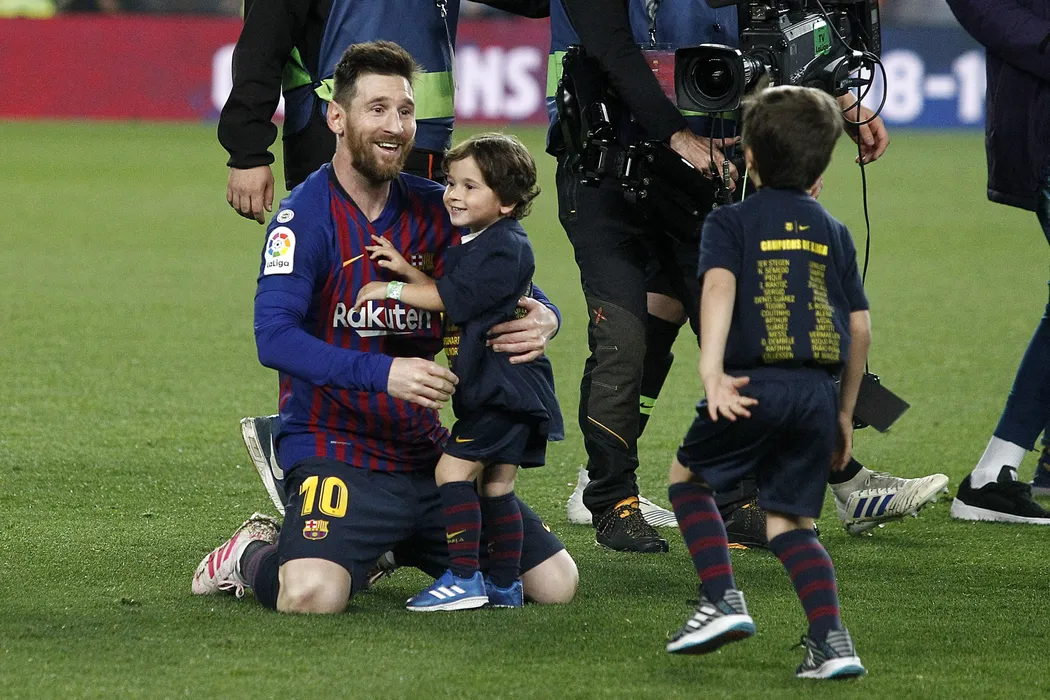 FC Barcelona's Leo Messi celebrates with his children the victory in La Liga 2018/2019. On April 27,2019 in Barcelona, Spain. Photo by Acero/Alterphotos/ABACAPRESS.COM