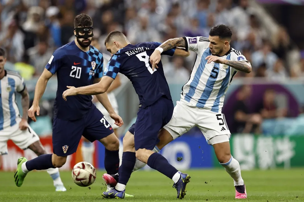 AL DAAYEN - (lr) Josko Gvardiol of Croatia, Mateo Kovacic of Croatia, Leandro Daniel Paredes of Argentina during the FIFA World Cup Qatar 2022 Semifinal match between Argentina and Croatia at Lusail Stadium on December 13, 2022 in Al Daayen, Qatar.