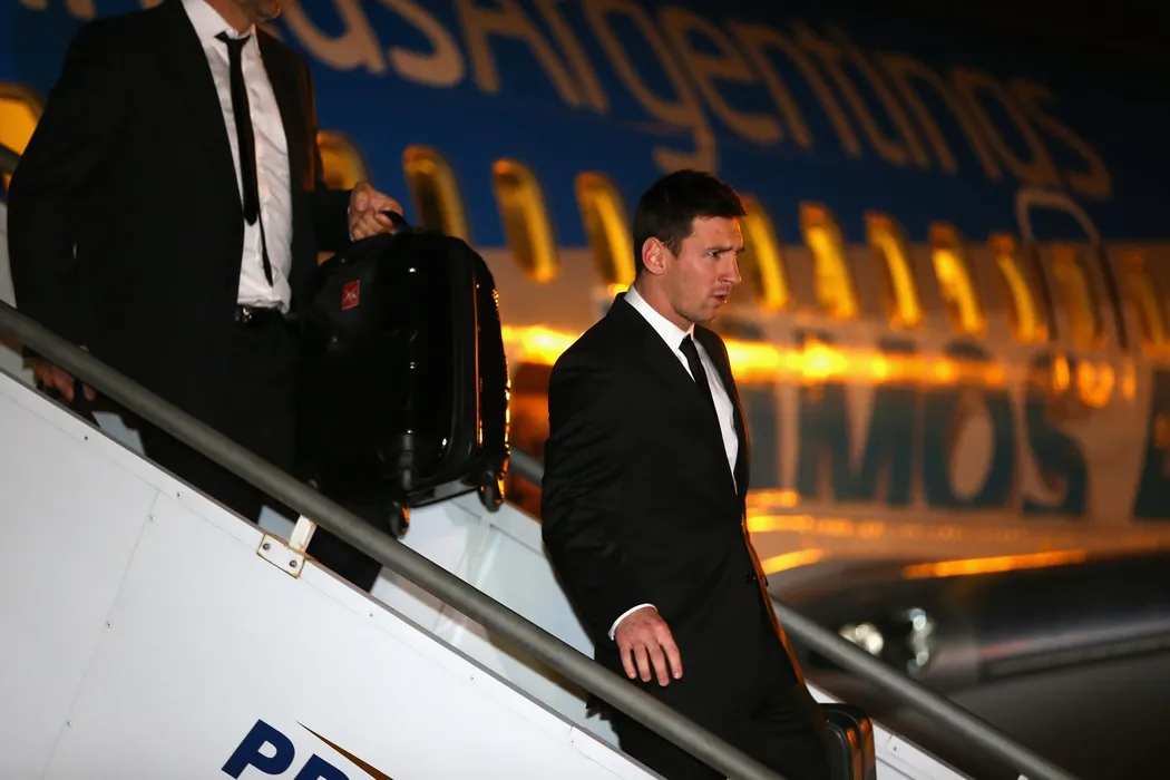 BELO HORIZONTE, BRAZIL - JUNE 09: Lionel Messi of Argentina arrives at Tancredo Neves International Airport ahead of the 2014 FIFA World Cup on June 9, 2014 in Belo Horizonte, Brazil. (Photo by Ronald Martinez/Getty Images)