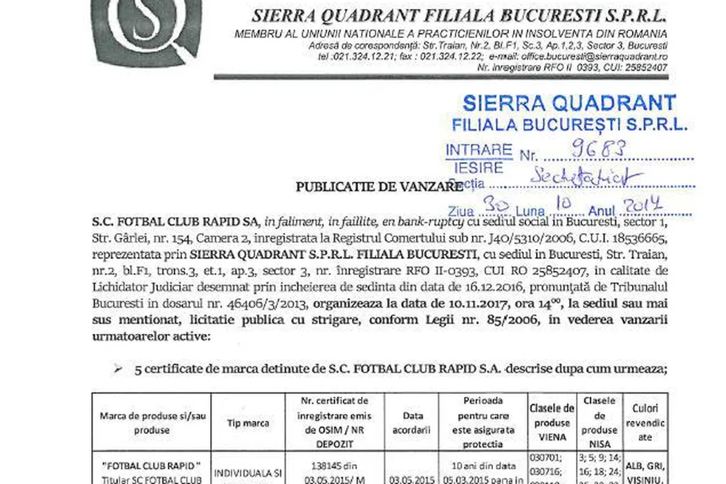 Licitația pentru Rapid se ține într-un apartament. Vânzarea publică cu strigare va avea loc pe 10 noiembrie, la etajul 1 al unui bloc din Strada Traian. Anunțul oficial și condițiile de participare pentru brandul al cărui preț pleacă de la 4 milioane de euro